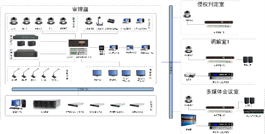 项目包含:1间知识产权审理庭,1间侵权判定室,1间调解室,1间多媒体会议室,使用4台2121非凡科技(AVSYS)多媒体综合管理一体机,实现统一控制管理,音视频调度,会议室互动等应用。