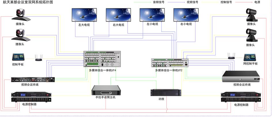 航天某部会议室采用2台2121非凡科技UT综合一体机作为两个视频会议网络的多媒体控制核心,分别管理两个网络的音频、视频设备,从而实现双网双控。两网系统共用一套麦克风、音箱及大屏幕,但音视频信号及控制相互独立。