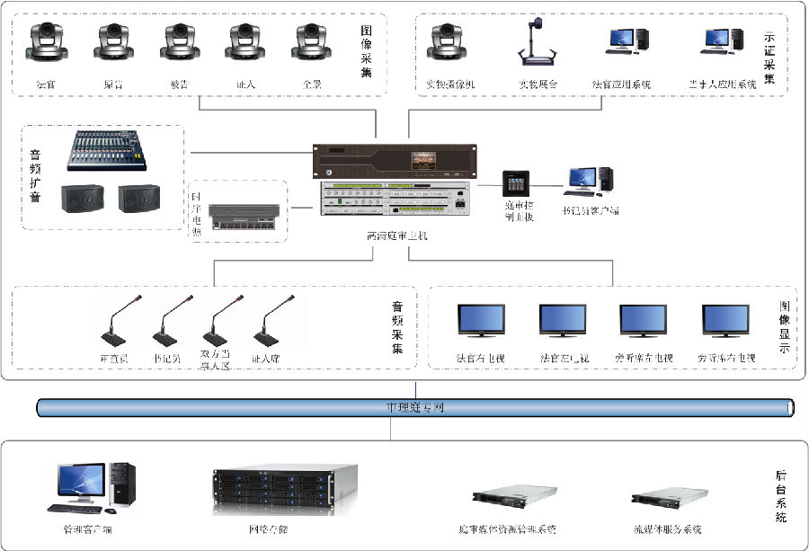 3、审理庭内的旁听学员通过庭内大屏幕显示设备,审理庭外的相关人员通过网络,对审理的各类案件实现学习、了解和监督。